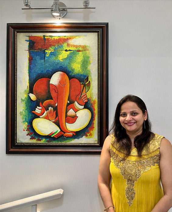 This painting took my breath away, and still does, Wonderful quality, I've never seen an elephant god portrayed with such a powerful yet simple form. Her art pieces deserve pride of place. Thank you, Mamta, for choosing an apt frame for it. It looks very beautiful in its frame on my wall. We both love it.